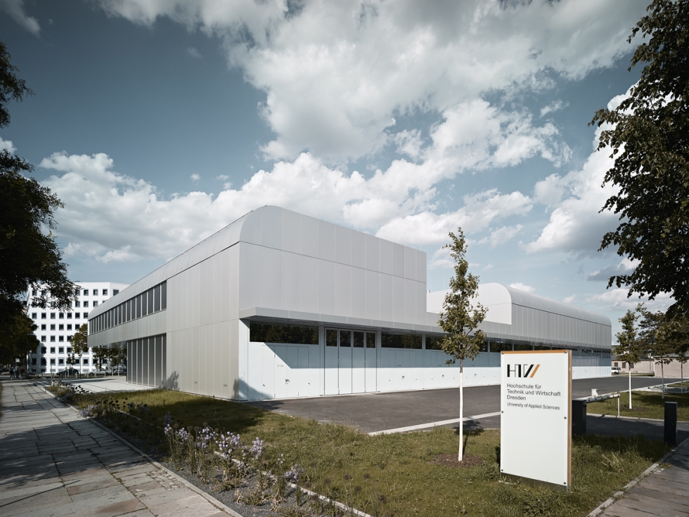 In dem Neubau des Technikums an der Hochschule für Technik und Wirtschaft in Dresden werden der Studiengang Fahrzeugtechnik und das Forschungsinstitut Fahrzeugtechnik (FIF) an einem Ort zusammengefasst. Mit dem Neubau wird ein wichtiger Baustein auf dem Campus der HTW geschaffen. Da gerade im Fachbereich Fahrzeugtechnik die Zusammenarbeit zwischen Wirtschaft und Wissenschaft gefördert werden soll, muss das Technikum über die selbstverständlich notwendige reine Funktionalität auch eine repräsentative Funktion übernehmen. Das Technikum wird Offenheit und Innovation ausstrahlen und der Fakultät für Fahrzeugtechnik ein unverwechselbares Image geben. Daher wird der Gebäudehülle eine prägnante Form und Ausprägung gegeben, die bewusst Assoziationen zu Fahrzeug- und Maschinenteilen hervorruft. Als Fassadenmaterial wird deswegen eine leicht polierte Aluminiumverkleidung gewählt. Die Verglasung der Tore im Erdgeschoss und die Fensterflächen im OG sollten sich der Tönung und dem Erscheinungsbild der geschlossenen Bauteile annähern und sind daher leicht getönt und verspiegelt.