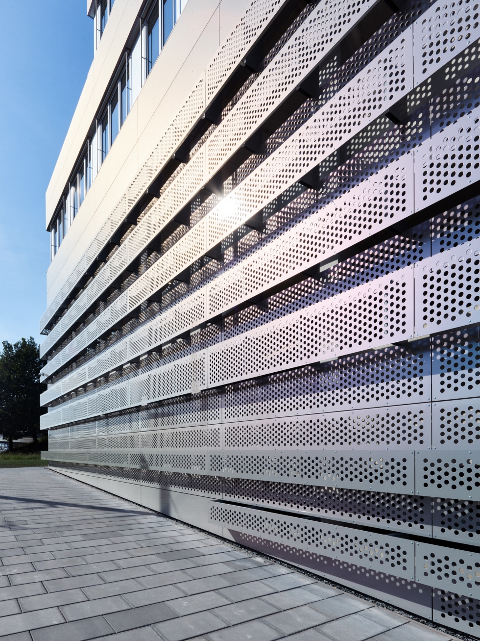 Über das Gebäude wird eine leichte Fassade gelegt, die wie ein buntes Kleid ein heiteres und gleichzeitig reizvolles Erscheinungsbild herstellt.