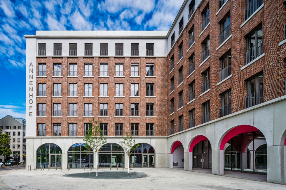 Der Stadtbaustein „Annenhöfe“ besetzt das letzte Baufeld am Postplatz. Als Blockrandbebauung mit großzügigem Innenhof konzipiert, umfasst das Gebäude eine zweigeschossige Tiefgarage sowie sechs oberirdische Geschosse.