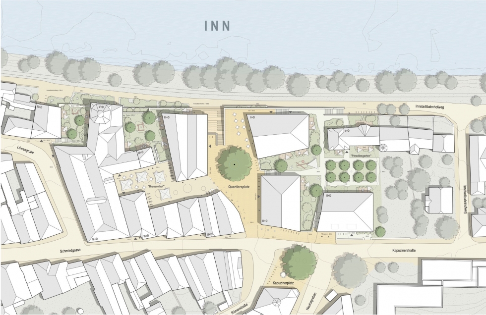 Zentrales Element des Entwurfs ist eine neue Quartiersmitte, die den Kapuzinerplatz mit dem Flussraum verknüpft und die jahrzehntelange Barriere des Industrieareals überwindet. Gesäumt von Gastronomie, Handel und kulturellen Nutzungen entsteht ein autofreier Stadtraum, der als lebendiger Treffpunkt für Märkte, Veranstaltungen und das tägliche Miteinander dient.